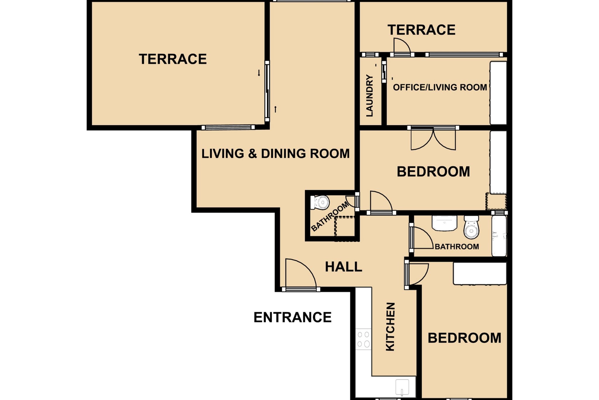 Et annet stort soverom har også innebygde garderobeskap og et mindre bad. Ved siden av dette soverommet ligger et allrom med garderobevegg og utgang til en annen terrasse med sol nesten hele dagen. Innenfor terrassen ligger vaskerommet, komplett med vaskesøyler og hyller for oppbevaring og tørking.
