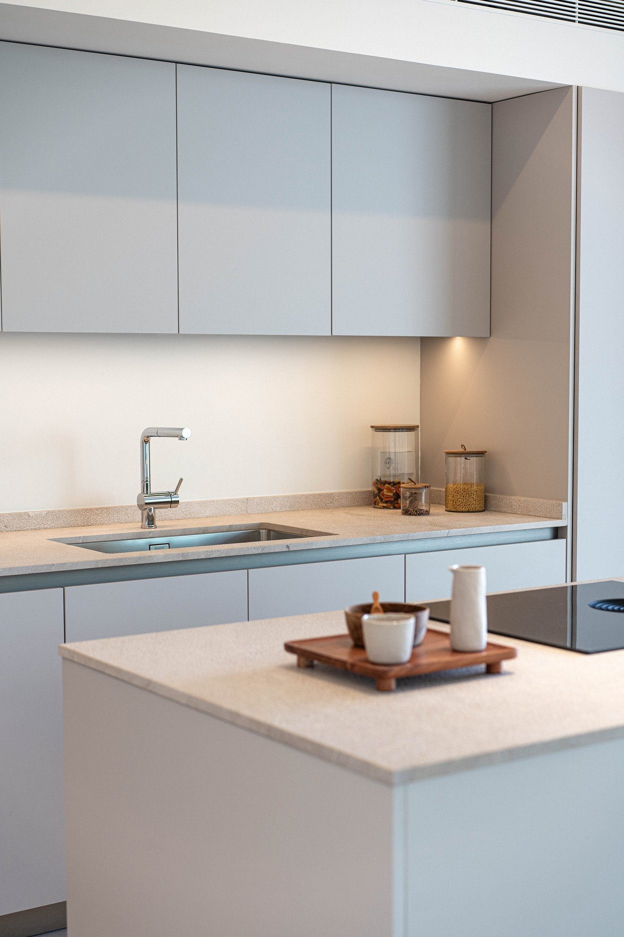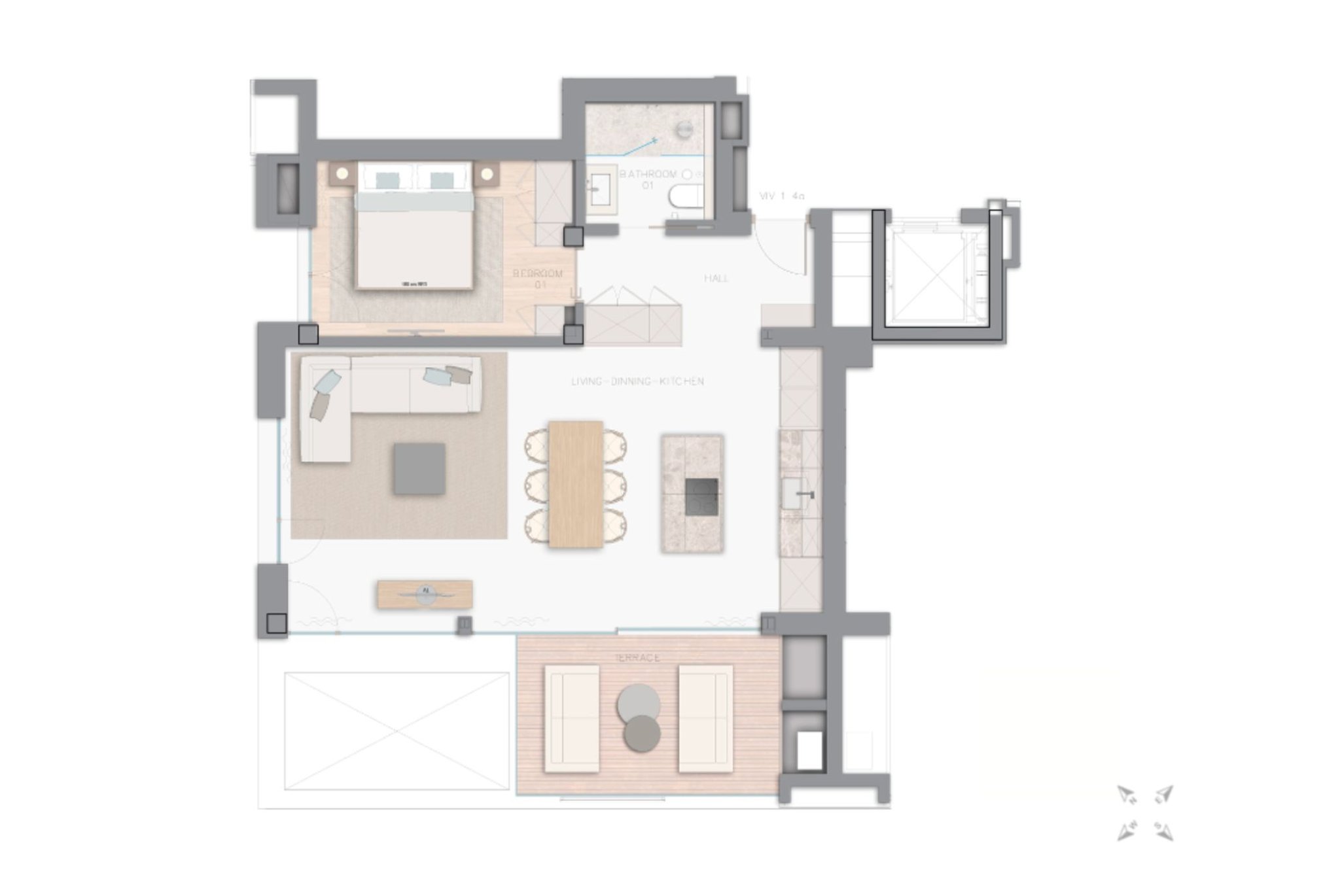 Leiligheten har et boareal på 68 m² og har et stort soverom og et bad. Den åpne planløsningen mellom det moderne kjøkkenet og den lyse stuen skaper en sosial og luftig atmosfære. Fra stuen kommer du også ut på en privat terrasse på 13 m². Boligen holder en gjennomgående høy standard med kvalitetsmaterialer, stilig inventar og rikelig med lys som forsterker den allerede lyse og moderne følelsen.