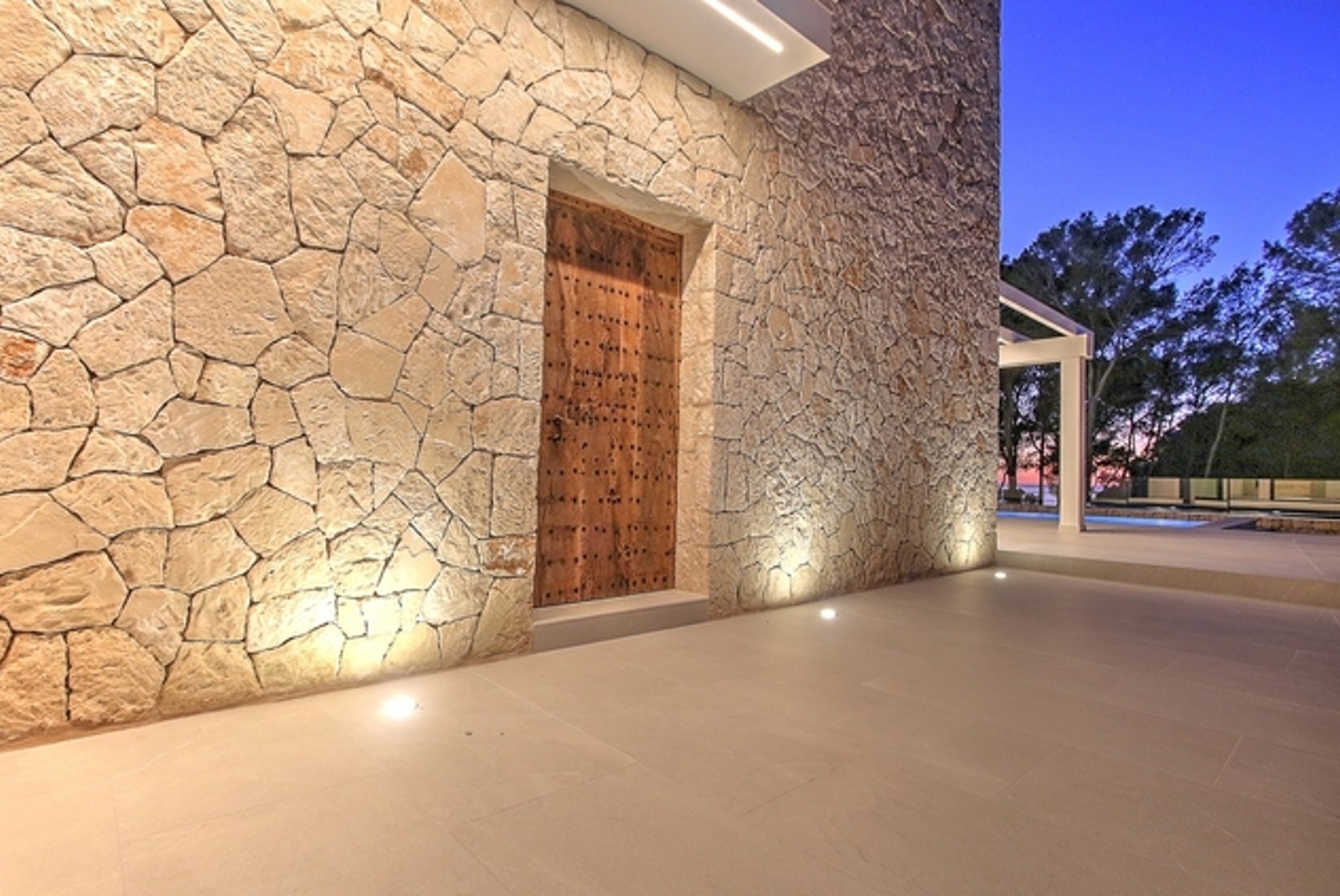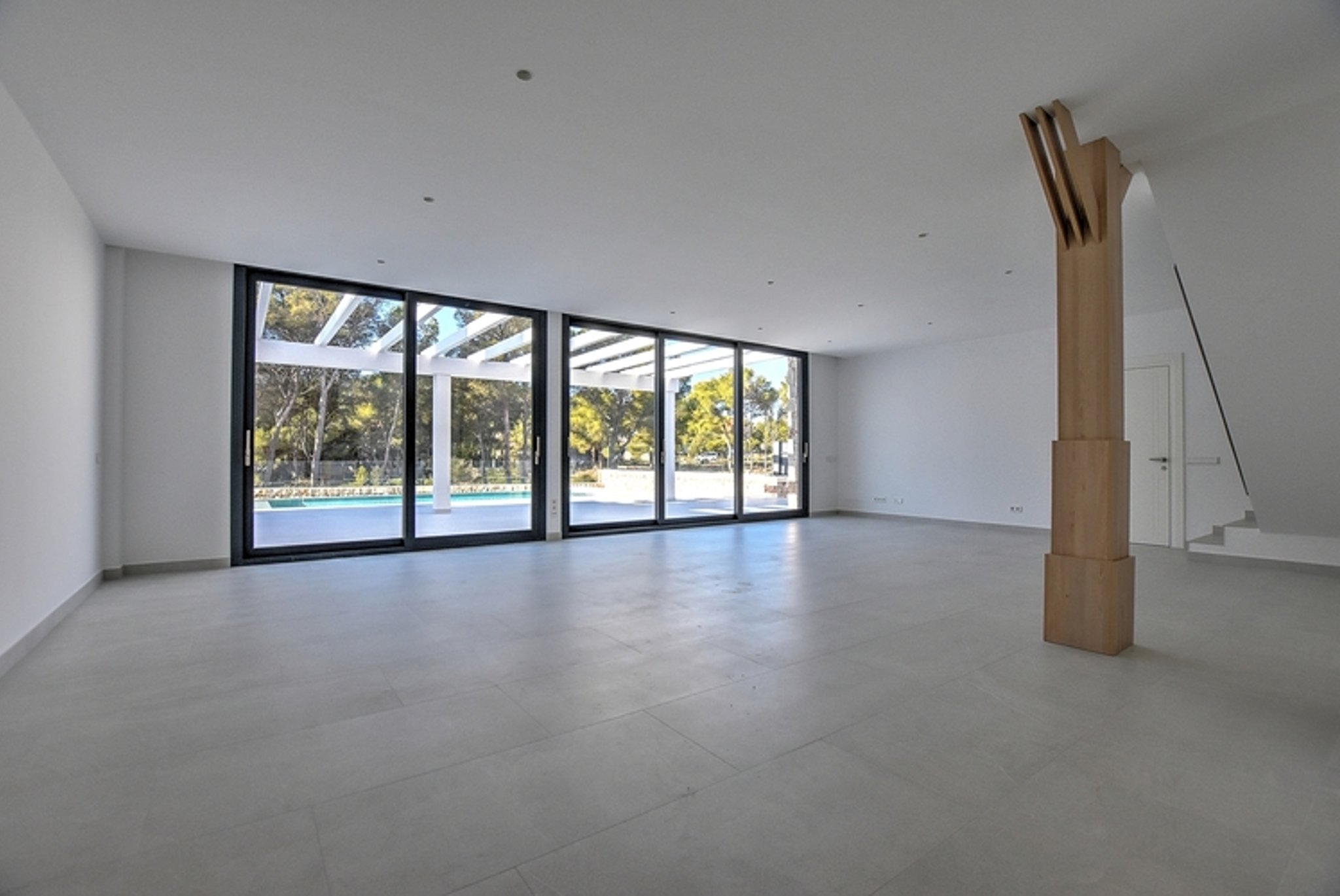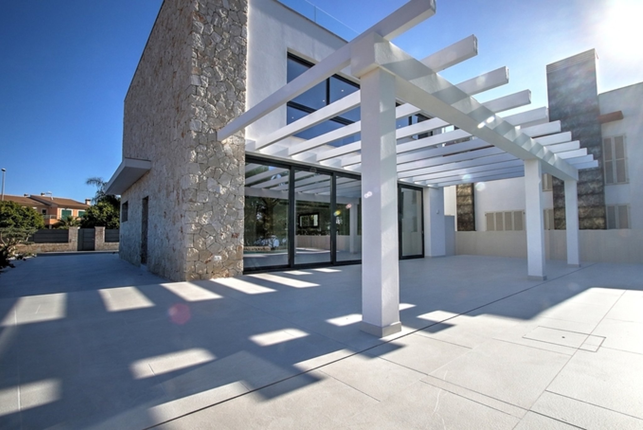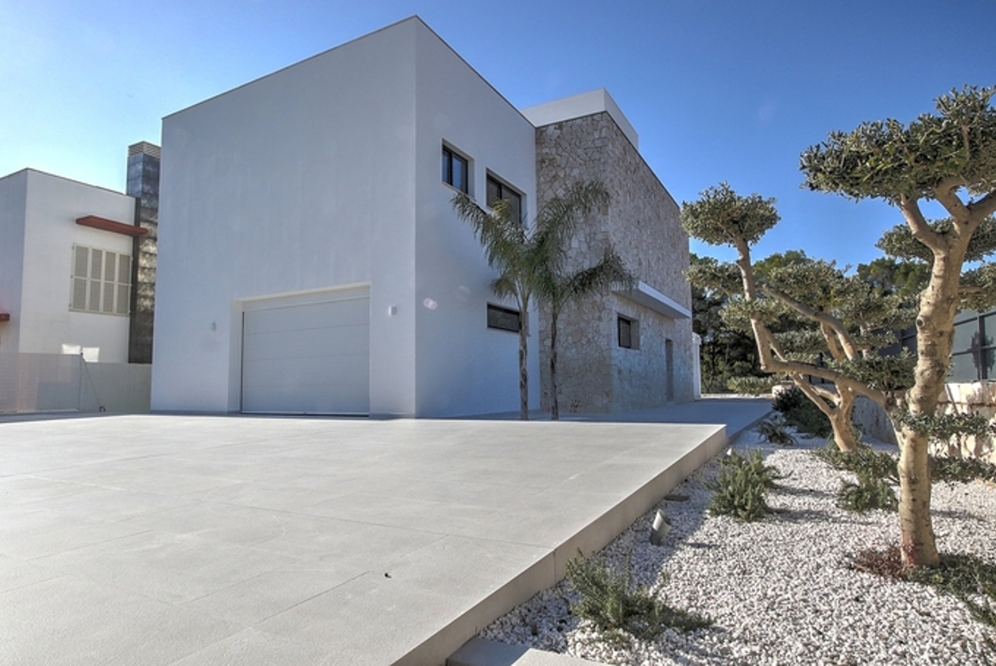 This is a beautiful newly built villa, on the seafront in Puig de Ros, on the southeast coast of Mallorca. It is very close to the exclusive Mhares Beach Club and Maioris Golf, and only 15 minutes drive from the center of Palma. In perfect Mediterranean harmony, in front of the house there are some pine trees that have been pruned and allow the views to the sea.