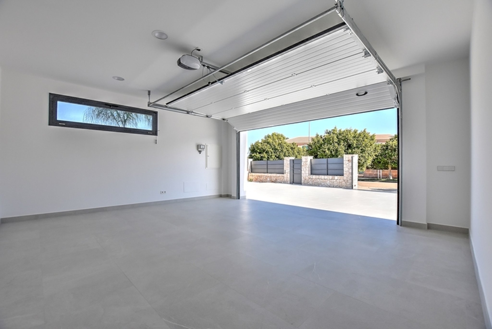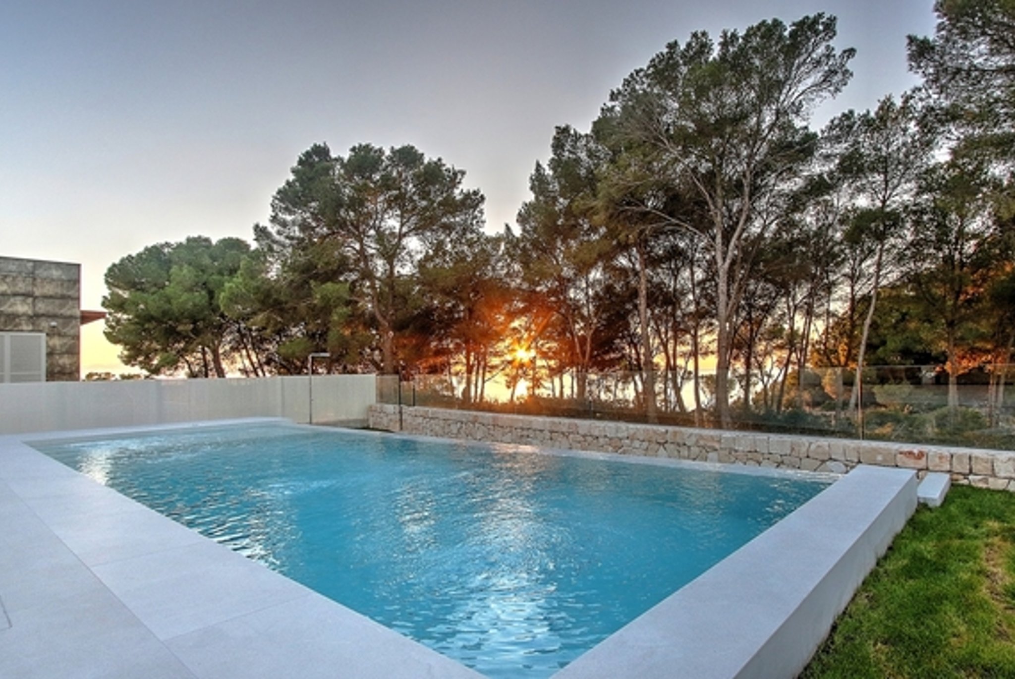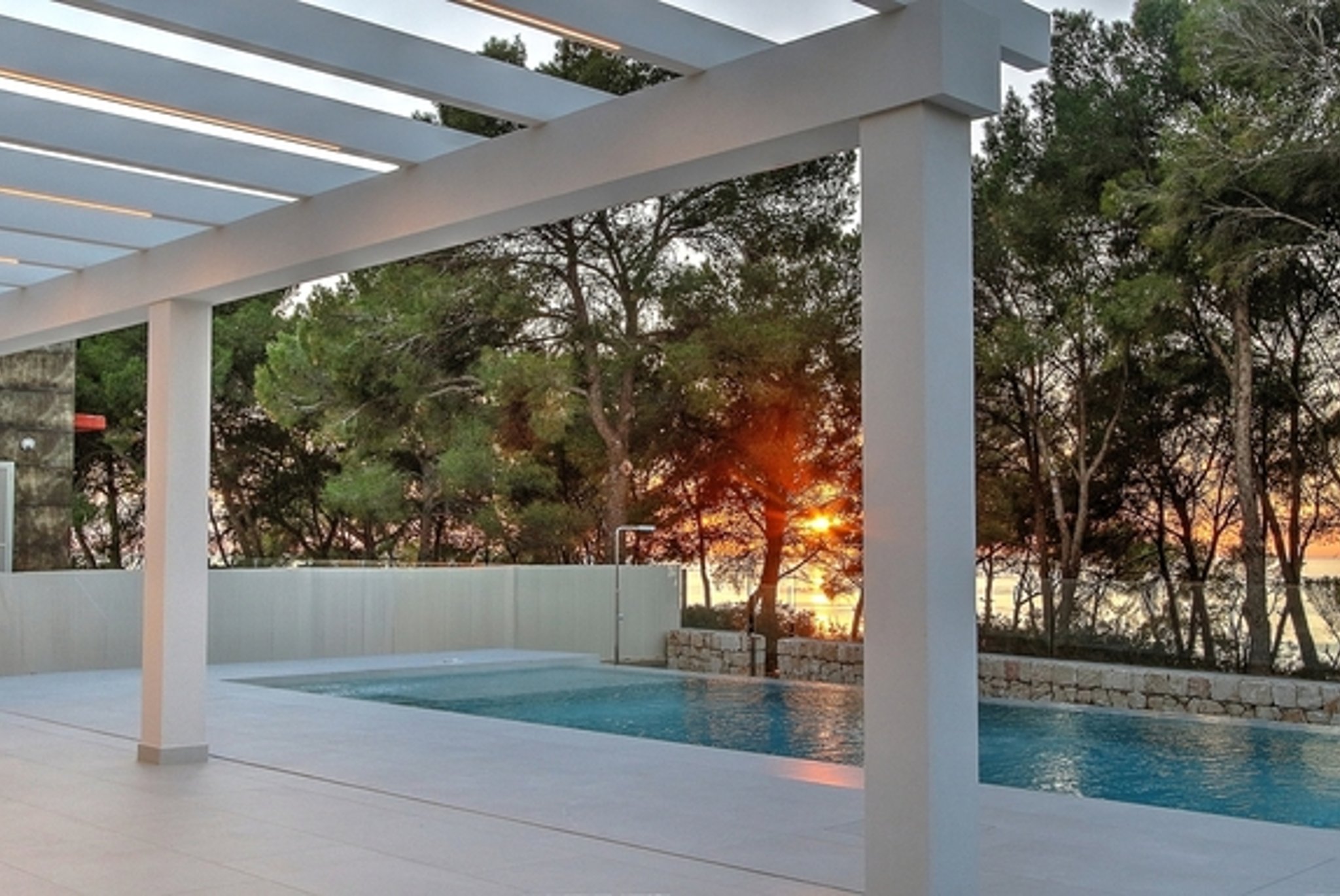 The two-storey villa has been built with the best materials and has 4 bedrooms and 4 bathrooms, 3 of them en suite, a large kitchen, an open plan living room with large windows and sliding doors that open onto the terrace with your pool and Mediterranean views. The villa also has a roof terrace, as well as a garage and a laundry room. Inside and outside, the same stone floor was placed which gives a feeling of spaciousness, elegancy and luxury to the house. The infinity salt water pool has been featured with elegant gray tiles. The house has an easy maintained garden and between the pines you can enjoy the view of the sea and the sky.
